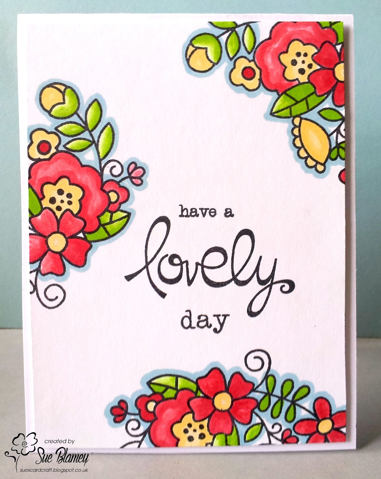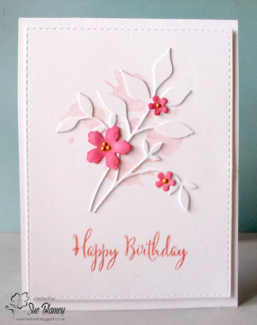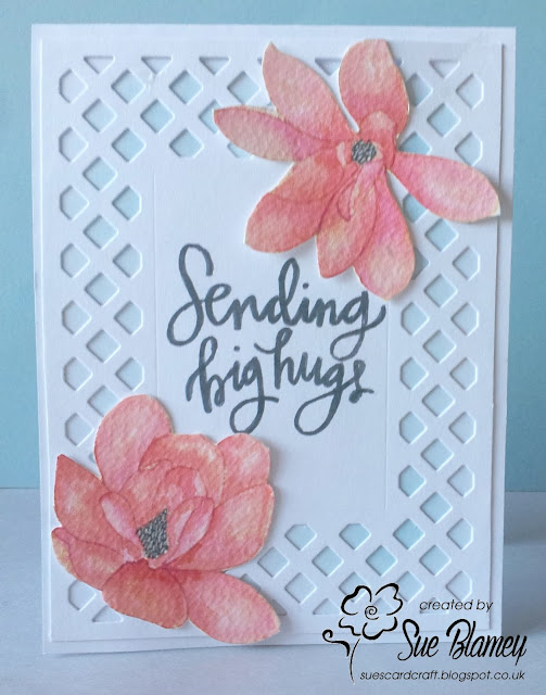 To make my card, I applied distress inks with a sponge to the raised side of a dotty embossing folder, spritzed lightly with water and pressed my card down onto the embossing folder. This was the first time I've done this technique so I was happy it came out OK. Added a stamped sentiment and flower and water coloured "hello" die cut.